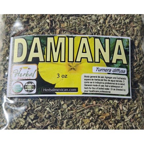 Damiana es una planta también conocida como Damiana Aphrodisiaca, Feuille de Damiane, Herba de la Pastora, Houx Mexicain, Mizibcoc, Old Woman's Broom, Oreganillo, Rosemary, Thé Bourrique, Turnera, Turnerae y otros nombres.
